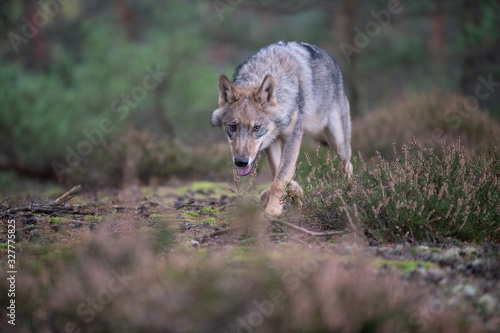 Fototapeta premium Lone wolf running in autumn forest Czech Republic