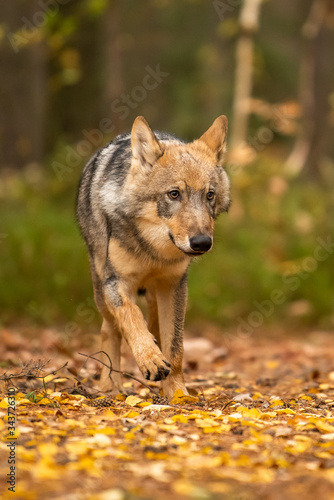 © vaclav, Naklejka premium Lone wolf running in autumn forest Czech Republic