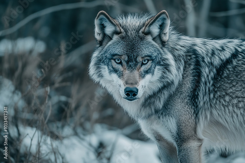 © YouAreBeautiful, Fototapeta premium Lone Wolf Symbolizing Anger in Cold Wilderness - Tense Posture