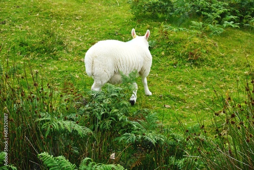 © John, Obraz premium Lone woolly white sheep runs through a grassy meadow surrounded by leafy ferns