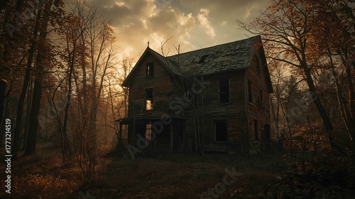 © diah, Obraz premium Lonely aged timber house rests forgotten in a desolate meadow surrounded by a fading forest at warm golden sunset autumn season horror wallpaper background