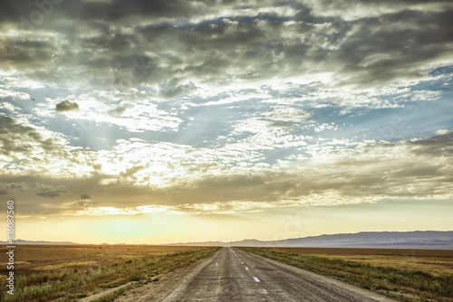 Naklejka premium lonely asphalt road against the backdrop of high mountains at sunset on a...