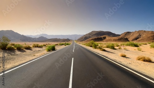 Fototapeta premium Lonely Asphalt Road Stretching Through an Expansive Desert Landscape with Rugged Hills and Endless Horizons Capturing the Spirit of Adventure and Exploration under a Vast Blue Sky