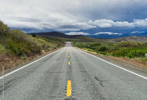 Naklejka premium Lonely asphalt road through the mountains in Nevada, USA