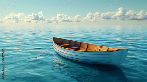 Naklejka premium Lonely Boat Gently Floating on Calm Ocean Under Clear Sky picture