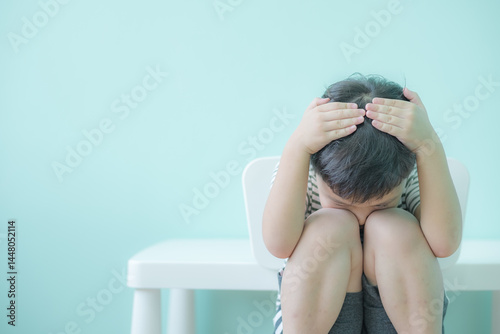 © Treechada, Fototapeta premium Lonely boy sitting alone. Preschool child with unhappy or sad face. Copy space for text.