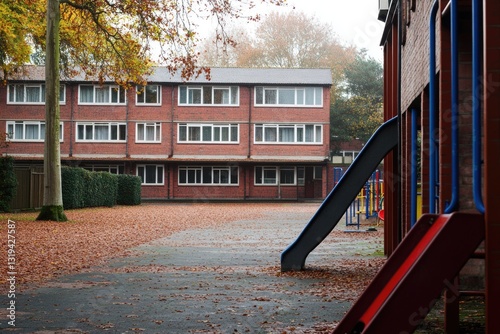 © Serhii, Fototapeta premium Lonely British School: A Quiet Playground Awaiting Young Learners