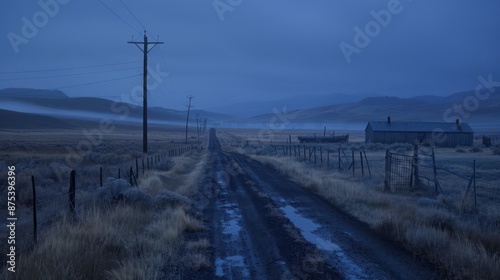 Fototapeta premium Lonely country road stretching far in the blue hour's serene mist.