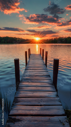 © Brett, Fototapeta premium Lonely Dock Bathed in the Warm Glow of a Setting Sun - Breathtaking Scenic Beauty of Nature