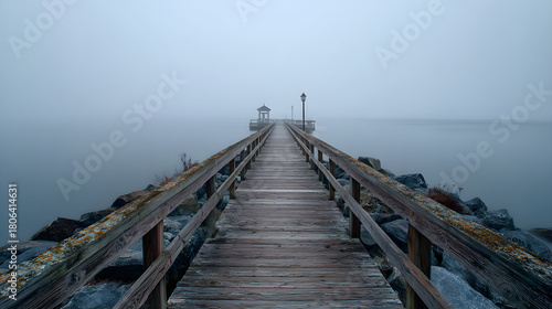 © Aqsa, Obraz premium Lonely dock stretching into the fog with vanishing horizon