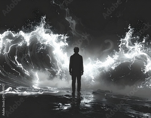 © Alfonso, Obraz premium Lonely Figure Engulfed by Endless Glowing Waves of Anxiety
