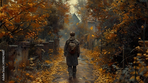 Fototapeta premium Lonely Figure Walking Through Autumn Forest Path