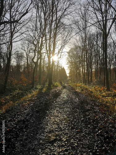 © Marcel, Fototapeta premium Lonely forest path in strong backlight on sunny winter day