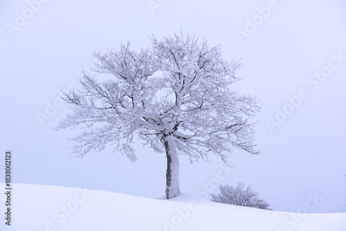 © Ivan Kmit, Fototapeta premium Lonely frozen tree on a snowy hill in winter mountains. Minimal snowy landscape in soft twilight