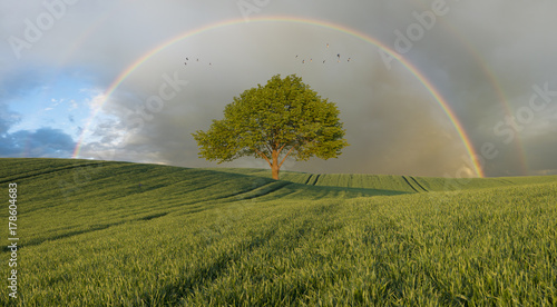 Naklejka premium lonely, green tree on a green field, rainbow in the sky