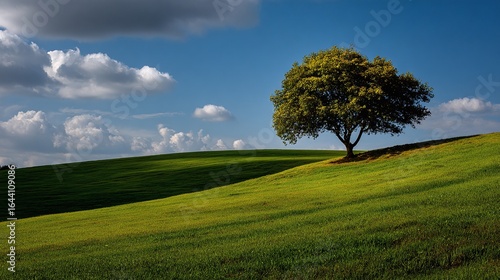 © Zander, Obraz premium Lonely Green Tree on a Rolling Hill under a Blue Sky - Tranquil Landscape