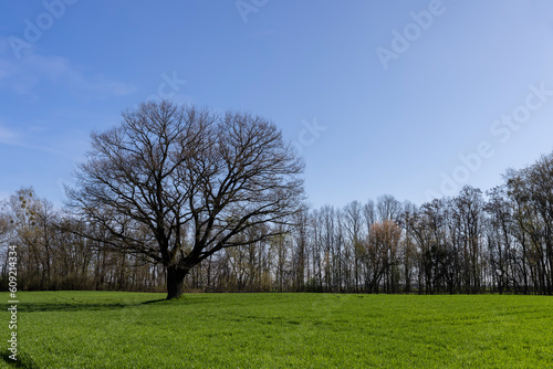 Fototapeta premium lonely growing oak without foliage in early spring