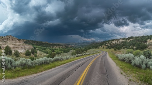 © Futureaz, Naklejka premium Lonely Highway Leading into a Brewing Thunderstorm