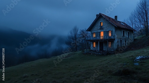 Fototapeta premium Lonely House on a Foggy Hill at Dusk
