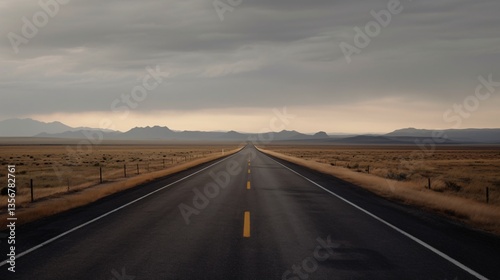 Fototapeta premium Lonely Journey Ahead on an Asphalt Road Under a Cloudy Sky in the Vast Open...