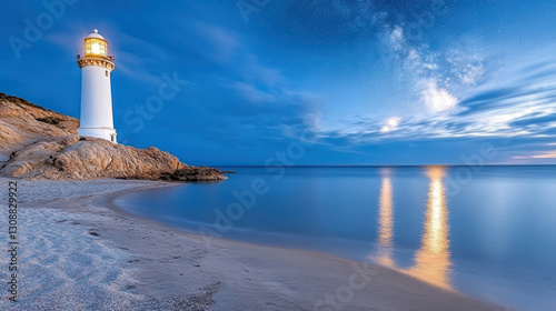 © siraphol, Fototapeta premium lonely lighthouse on desolate shoreline under starry sky