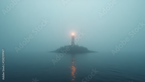 Fototapeta premium Lonely lighthouse on small rocky island surrounded by fog and still water