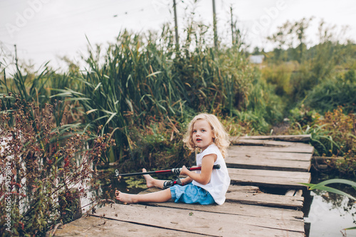 Naklejka premium lonely little child fishing from wooden dock on lake