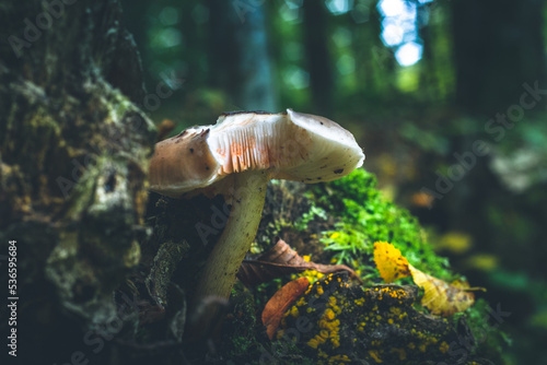 © Jakub Łukasik, Obraz premium Lonely mushroom on the green background. Damaged gills.