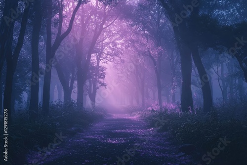 © Hunman, Obraz premium Lonely path through forest with mist, space for text.