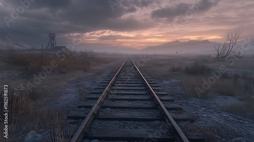 Fototapeta premium Lonely Railroad Tracks Vanishing Into Sunset Mountains