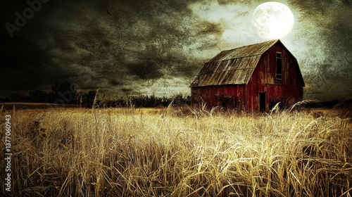 Obraz premium Lonely Red Barn Under a Full Moon