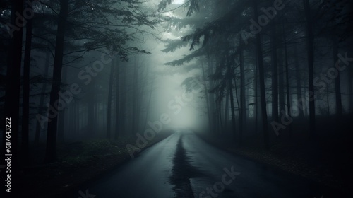 Obraz premium lonely road in the forest with heavy fog, blurred, high quality, copy space,...