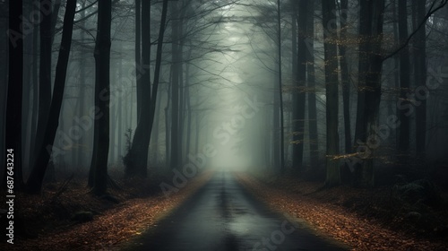 Naklejka premium lonely road in the forest with heavy fog, blurred, high quality, copy space, 16:9