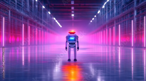 © video, Fototapeta premium Lonely robot standing in a large futuristic corridor with glowing purple and pink neon lights creating a surreal and mysterious atmosphere