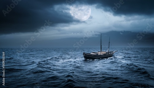 Fototapeta premium Lonely sailboat at sea under a full moon