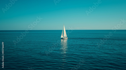 Obraz premium Lonely sailboat is sailing in the deep blue ocean on a beautiful sunny day