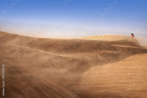 © Natallia, Fototapeta premium Lonely sand dunes in a strong wind under the sky against the background of arid desert