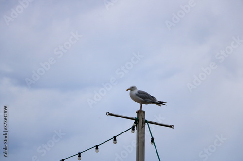 © Dynamoland, Obraz premium Lonely seagull looking in harbor of Rostock-Warnemünde