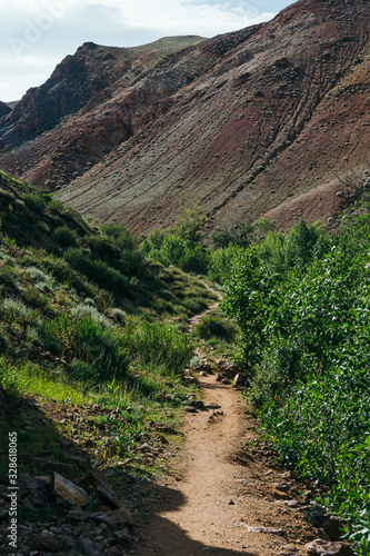 Fototapeta premium lonely stone path among trees and rocks, hiking in mountains, traveling...