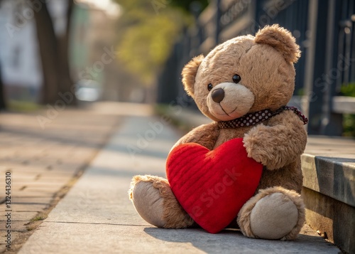 © Animal Photo, Obraz premium Lonely Teddy Bear Holding Red Heart on City Sidewalk