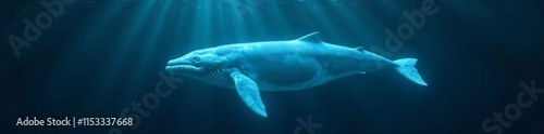 Fototapeta premium Lonely translucent whale floats in dark ocean depths, solitude, sea creature