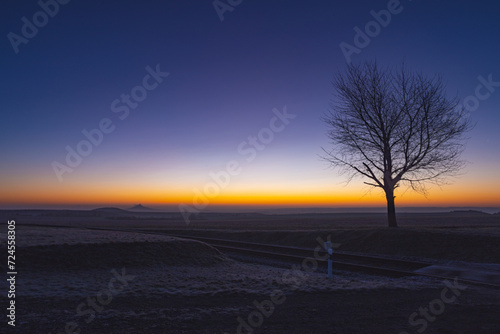 © Radomir Rezny, Fototapeta premium Lonely tree and silhouette of a Hazmburk castle in a frosty morning