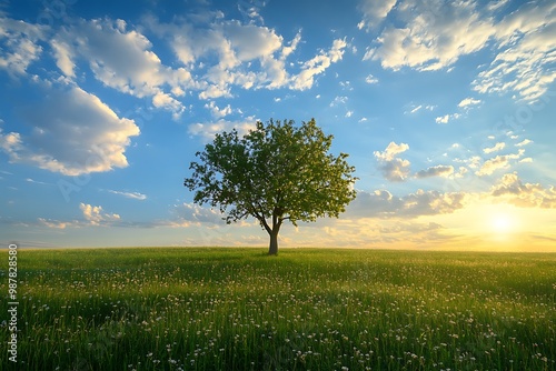 Obraz premium Lonely Tree in a Field at Sunset with Dramatic Sky