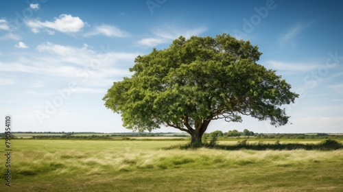 Obraz premium lonely tree in a meadow against a blue sky with clouds, landscape background