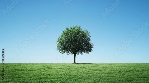 Obraz premium Lonely tree in an expansive green field under a clear, bright blue sky during...