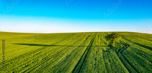 © resul, Fototapeta premium Lonely tree in nature. Tree in green fields wheat with blue sky. magnificent view of the tree and its shadow. Aerial drone shot.