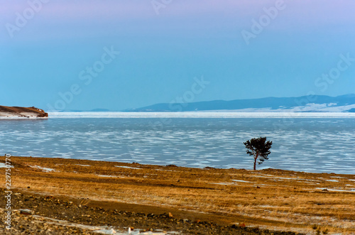 Fototapeta premium Lonely tree is staying near frozen lake and road with mountain background