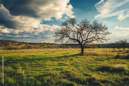 © syifa, Fototapeta premium Lonely tree on a grassy field under a cloudy sky