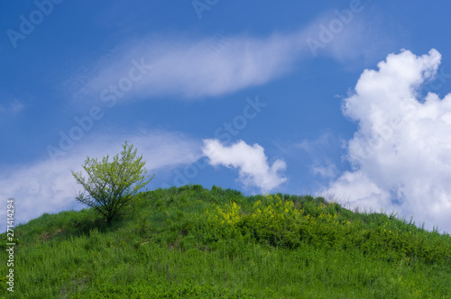 © Дмитро Скоробагатько, Obraz premium Lonely tree on a hill under a blue sky