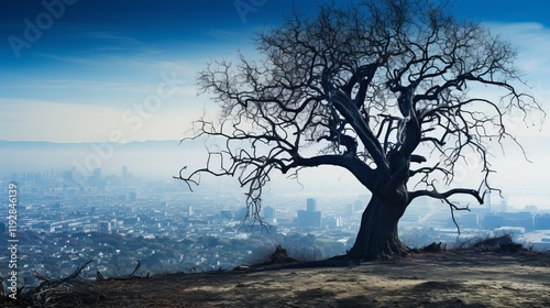 © Maksym, Obraz premium Lonely tree silhouetted against a hazy cityscape at dusk. Generative AI